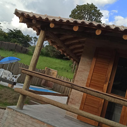 Cada casa conta com uma piscina privativa, 2 quartos (com acomodações para até 7 pessoas), 1 banheiro e área gourmet externa com cozinha/churrasqueira.